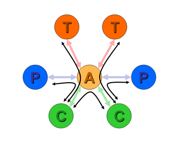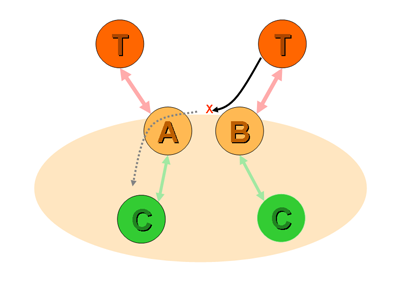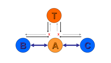 Furthermore, suppose provider A uses provider T as an upstream transit provider. A is now a customer of T (Figure 2). Should A announce T's routes to either of the peer providers B or C? Again the answer is no. T is A's provider, and is not funding A for any form of transit service. Neither B nor C are paying A for transit services, so A has no funding to provide transit between B or C and T.