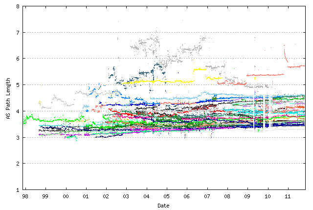As shown in Figure 10, the Internet has been remarkably steady in terms of an average AS Path Length metric for more than 10 years. Over the same extended period the number of routing entries has grown from 50,000 to 300,000 entries, yet the "diameter" of the Internet has remained relatively constant, and all the routing domain growth has increased its "density" of interconnection rather than its radial length. In such an environment BGP has been able to scale very effectively, as the limits to the amount of update traffic required for BGP to reach convergence appears to be more strongly related to the "diameter" of the Internet, in terms of AS hop count, than it is related to the "density" of the Internet, in terms of AS interconnectivity metrics. So a more densely connected Internet that preserves the diameter appears to take the same time to reach convergence as the network grows. It is a reasonably conjecture that a more sparsely connected Internet that extends the diameter of the network as it grows would exhibit increasing convergence times and increasing number of updates to reach convergence, but without radically altering the current arrangements of peering and interconnection in today's Internet this is a challenging conjecture to prove via direct observation!