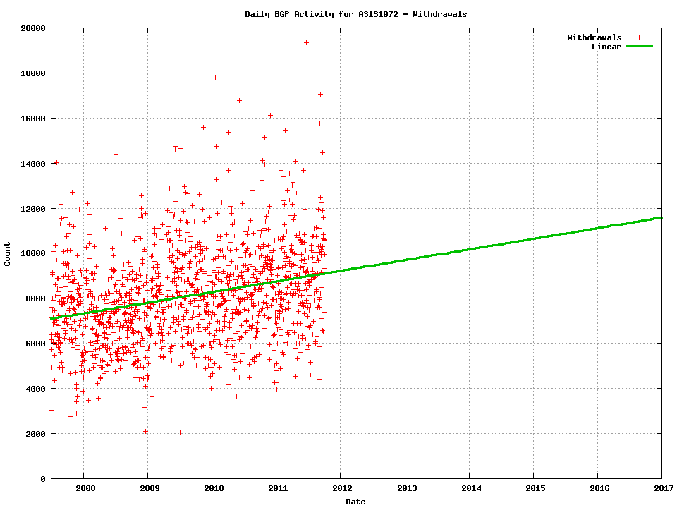 In attempting to address these questions I have used a data set that includes every BGP update over a period of several years at AS 131072. Before examining the data I should note the circumstances this AS. It lies at the edge of the network, and does not provide transit to any other network. Secondly, it is a single LAN, so there is no internal routing protocol, nor any iBGP within the network. Thirdly, the data collected and analyzed here relates to a single eBGP session. So what we are examining here is a pretty typical edge network's eBGP feed that has been stable over an extended period of time.