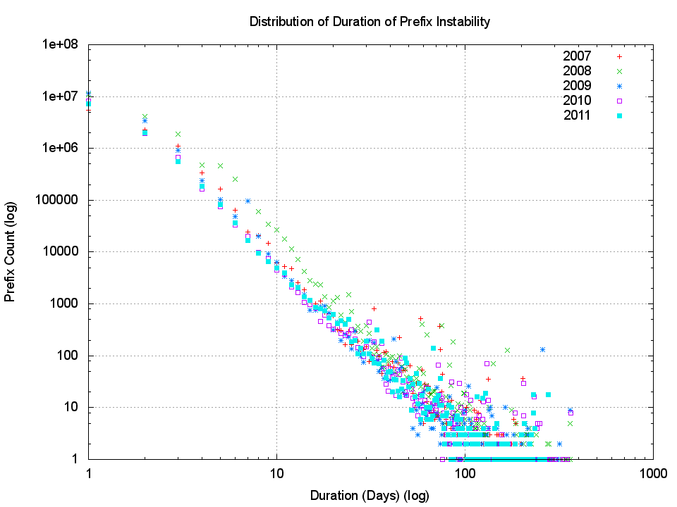 Some 10,000 prefixes are unstable for 14 days or longer, while 4,600 prefixes are unstable for 21 days or longer. Only 8 prefixes are unstable every day, which corresponds to the so-called" beacon prefixes that flicker between announced and withdrawn states on an hourly or two-hourly basis as part of a BGP research program. If we are looking for a "core" set of prefixes that are updated every day, then this is not evident in the BGP. Prefixes that are unstable become stable again very quickly, while the set of persistently unstable prefixes is a very small set indeed.
