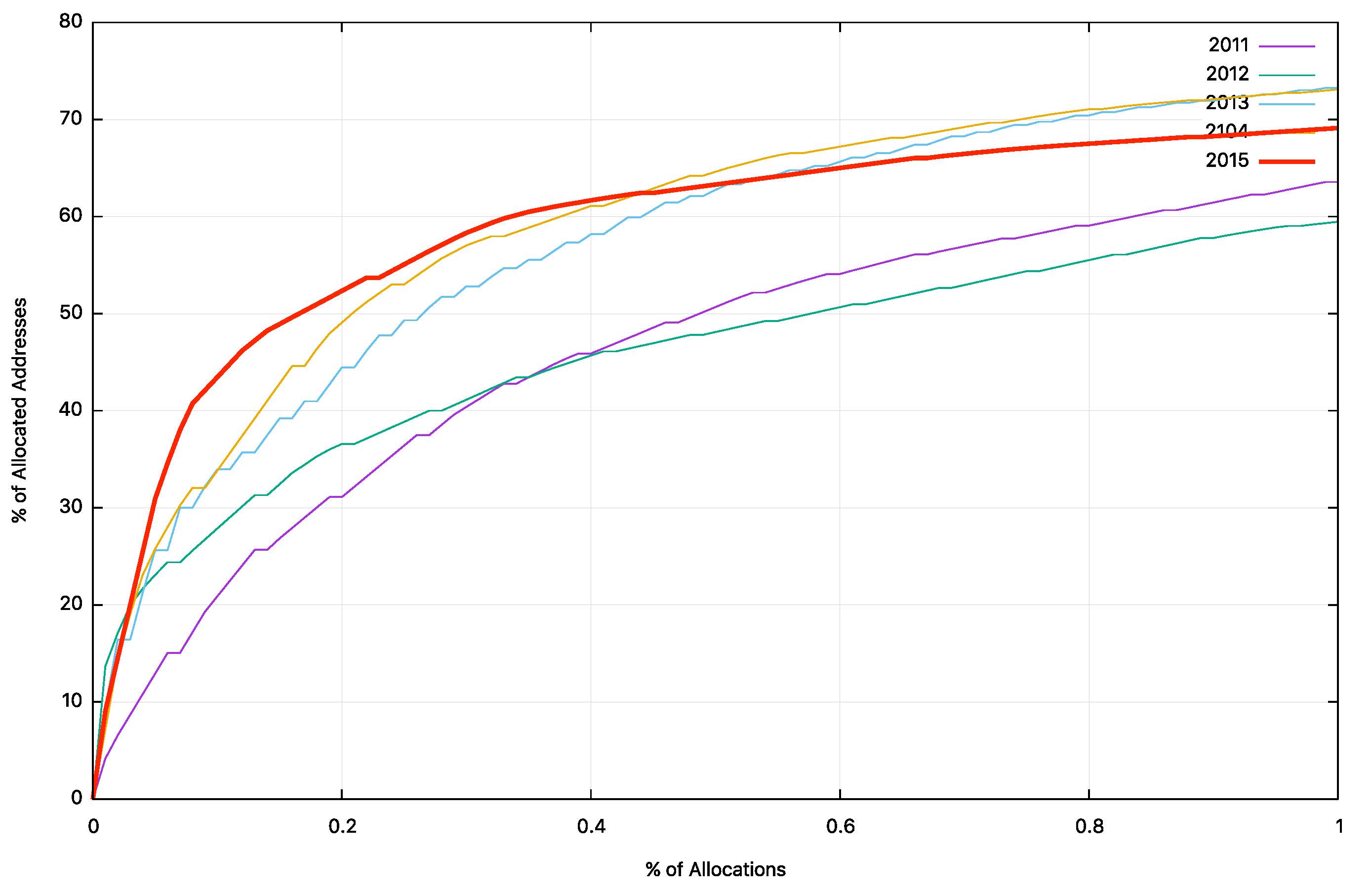 Figure 1 shows the address distribution for the years 2011 through to 2015. The shift over this period shows a relatively steady level in the proportion of address space being allocated to the larger providers. In 2011 one half of all addresses were allocated to 70 entities, while in 2012 80 entities consumed one half of all addresses, and in 2013 68 entities. In 2014 one half of the assigned address space was assigned to 39 entities, while in 2015 one half of all assigned address space was assigned to 21 entities. (Figure 2).