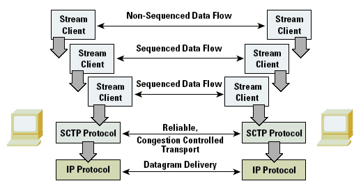 SCTP also functions in a form of transport-level multiplexing, where numerous logical streams can be supported across a single transport- level association. Although message order within an individual stream is preserved by SCTP, retransmission within one stream does not impact the operation of any other stream that is supported across the same SCTP transport association. Each stream has an explicit identification and a per-stream sequence identification to support this function. SCTP also provides for non-sequenced message delivery, where a message within a stream is marked for immediate delivery, irrespective of the relative order of the message within a stream (Figure 4).