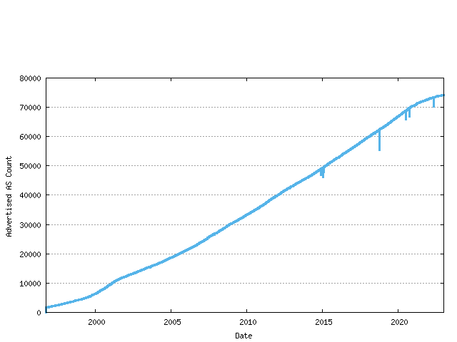 RIRs perform assignments of AS numbers to ISPs and end user entities. The cumulative number of assigned AS numbers over time is shown in the following figure.