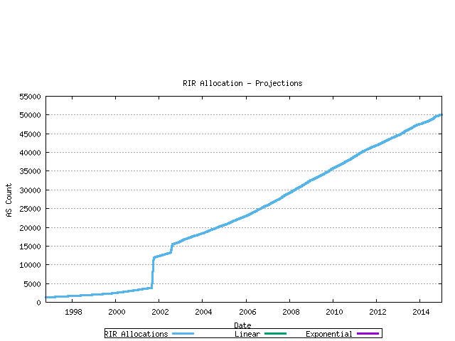 The question posed in this section is: when will the pool of 16 bite AS numbers be exhausted? The methodology used here is that of using previous allocation information to generate a trend model, and use that trend to extrapolate likely future consumption levels, and thereby generate a predicted exhaustion point. Of course making assumptions about the future has its risks, and often the future does not conform to current expectations. This is a quote from RFC1930, published in March 1996: