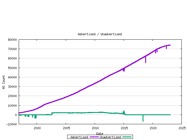 The difference between the assigned AS number count and the advertised AS number count is the unadvertised AS count. The following figure shows the number of advertised and advertised ASs as a time series.