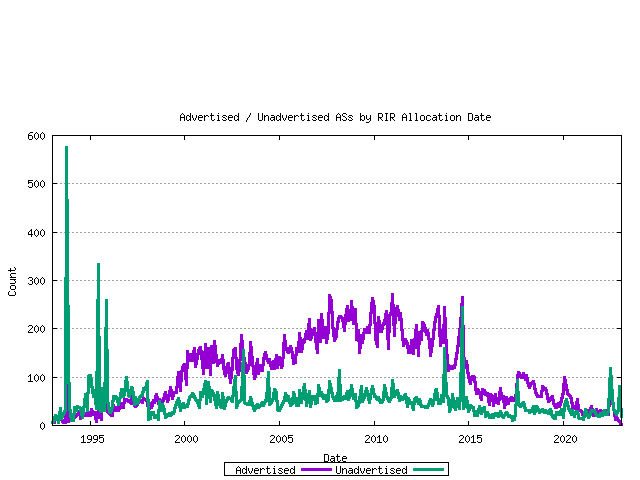 Taking the current set of assigned AS numbers, the set of advertised and unadvertised AS numbers can be matched against the RIR date of assignment. This is shown below.