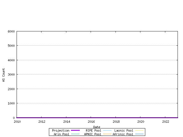 Using a model of each RIR's relative rate of allocation, it is possible to generate a model of 16-bit AS number consumption. Here the end point is the date where the first RIR has exhausted its available pool of 16-bit AS numbers, and no further numbers are available in the IANA unallocated pool to replenish the RIR's pool. The data available suggests a best fit predictive model where this will occur on 09-Jan-2023.