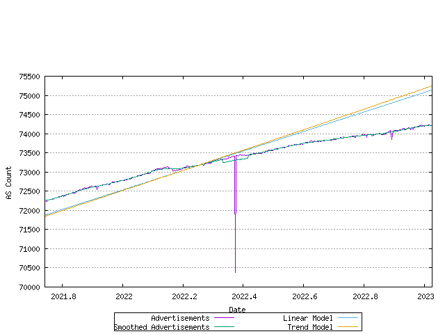The third view is that of projection of the advertised AS count. The assumption underlying this projection is that all the unadvertised ASs would ultimately be used in the advertised BGP table. Again linear and exponential models are used in the projections.