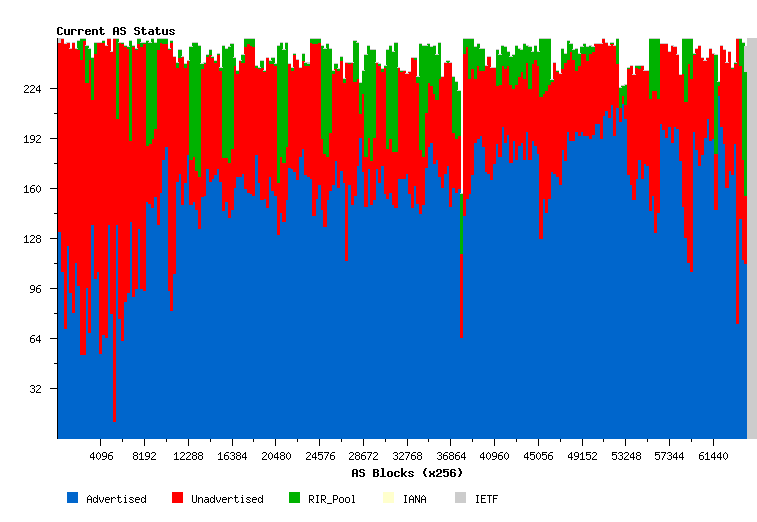 Another view of the AS number state pools is by grouping the AS numbers numerically. The following view shows all 65536 AS numbers, using 256 columns each describing a pool of 256 AS numbers. The IANA pool is formed from the higher numbered ASs. Within the allocated blocks, the lower-numbered AS blocks have a higher rate of assigned by unadvertised ASs as compared to higher numbered assigned AS numbers.